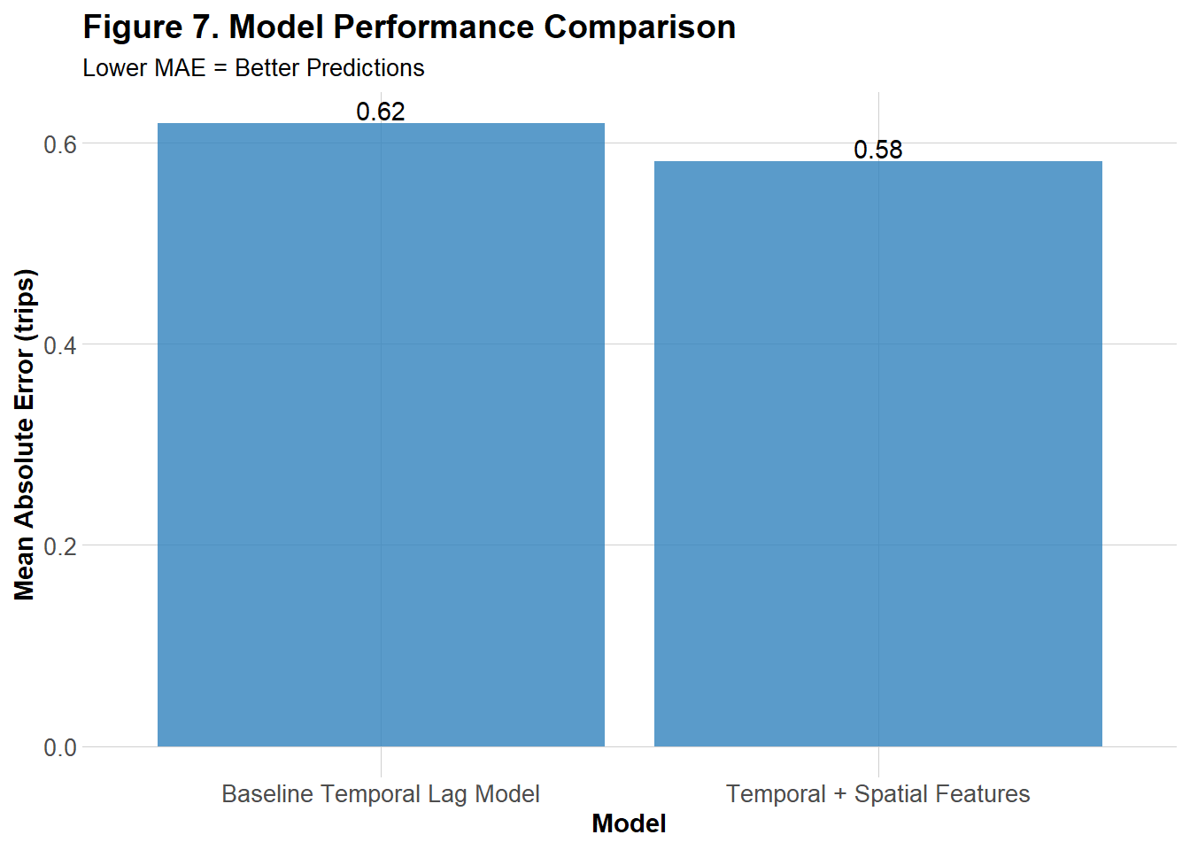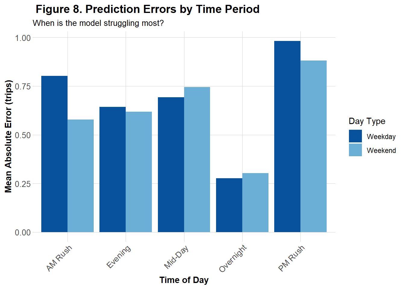 Figure 8 represents the MAE of the the improved model across 5 segmented time periods for both weekends and weekdays. While Model 2 tended to overpredict trip counts during low-demand periods, particularly overnight and mid-day on weekends and weekdays (see Figure 4), the improved model exhibited its highest mean absolute errors during the PM followed by AM Rush. This contrast suggests that Model 2 struggles more outside of rush hours, whereas the improved model has struggles more during peak commuting hours.