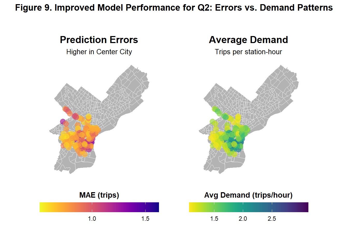 Figure 5 shows illustrates side-by-side how Model 2’s prediction errors and average demand vary spatially across Philadelphia in Q2. The left map shows that prediction errors are highest in Center City and slightly higher in parts of Upper North Philadelphia and West Philadelphia. The right map reveals that demand is also concentrated similarly in these area, suggesting that the model performs worst demand is high and thus prediction is more crucial.