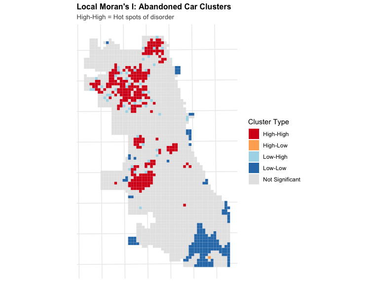 library(sf)# Step 1: Define cell size (in map units - meters for our projection)cell_size <-500# 500m x 500m cells# Step 2: Create grid over study areafishnet <-st_make_grid( chicago_boundary,cellsize = cell_size,square =TRUE,what ="polygons") %>%st_sf() %>%mutate(uniqueID =row_number())# Step 3: Clip to study area (remove cells outside boundary)fishnet <- fishnet[chicago_boundary, ]# Check resultsnrow(fishnet) # Number of cellsst_area(fishnet[1, ]) # Area of one cell (should be 250,000 m²)