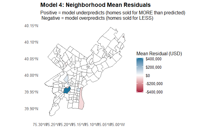 - Downtown neighborhoods tend to have under predicted values, while suburban areas show over predicted values