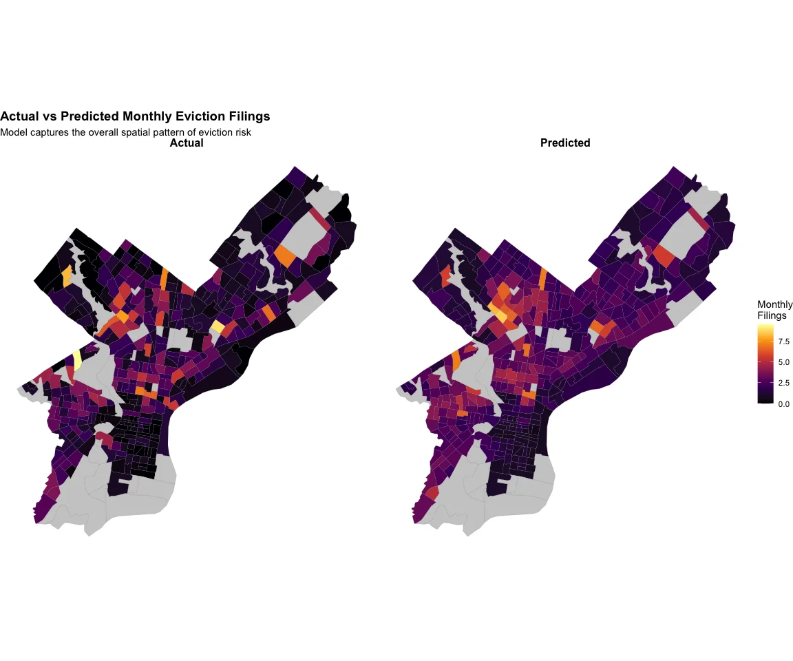 Model captures the overall spatial pattern of eviction risk across Philadelphia.