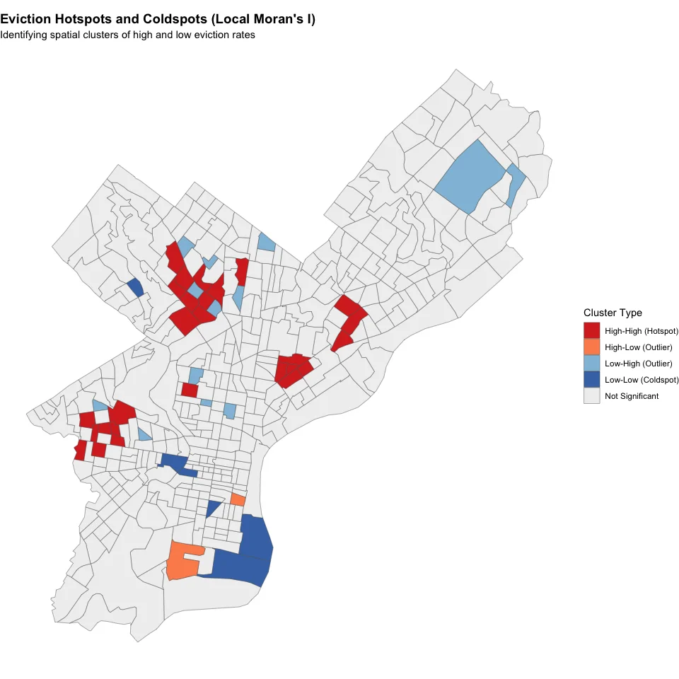 Hotspots (Red): North Philly, West Philly, Southwest | Coldspots (Blue): Center City, Far Northeast