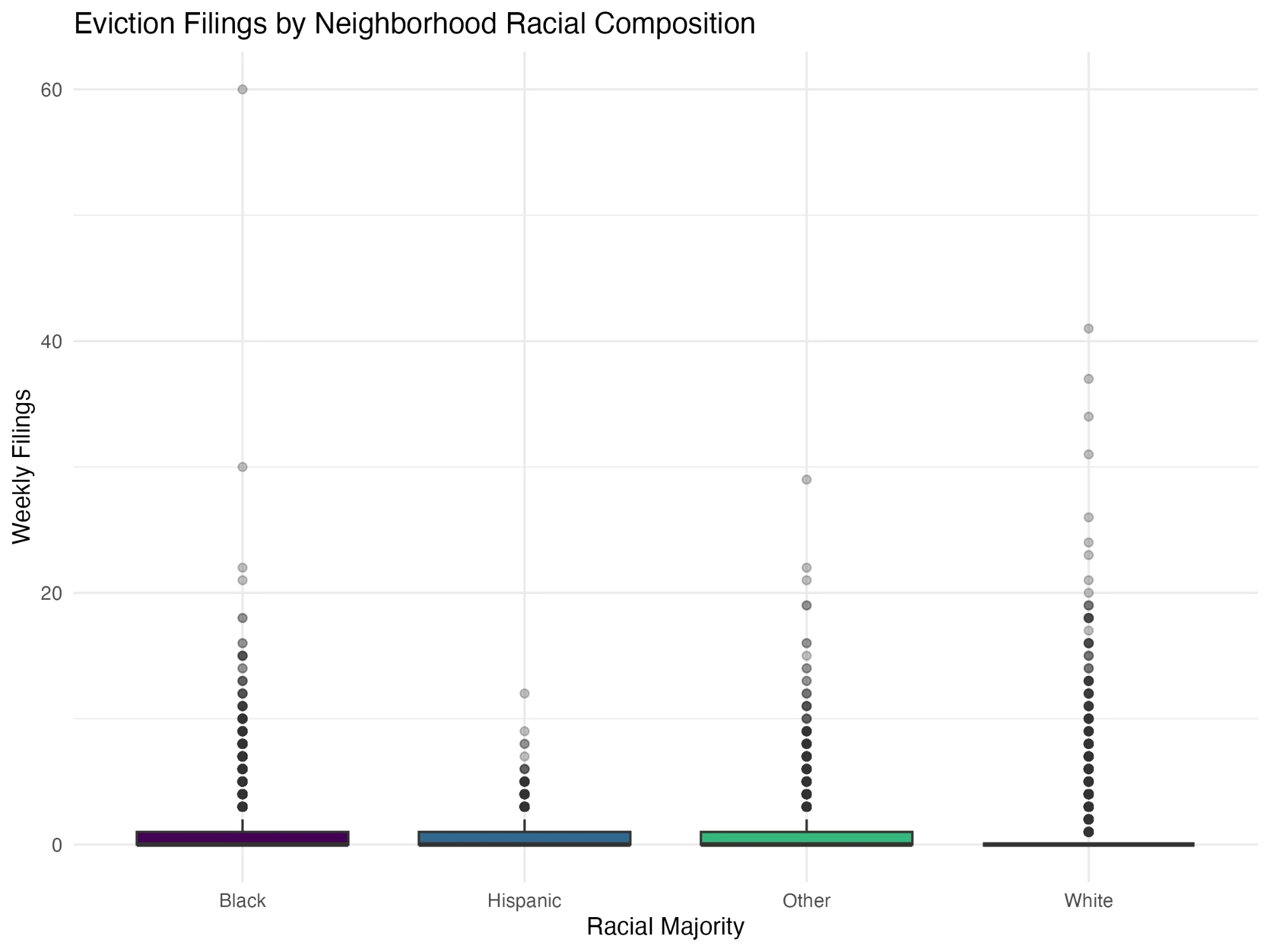 Neighbor evictions (spatial lag): Average evictions in nearby tracts — captures “spillover effect”
