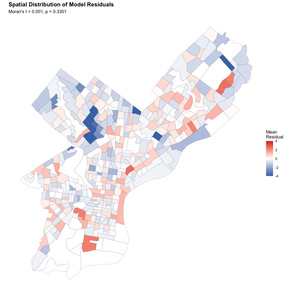 Moran’s I = 0.001, p = 0.33 — No significant spatial autocorrelation in residuals! ✓