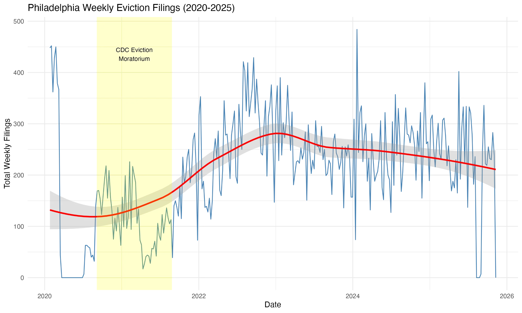 Yellow = CDC moratorium period. After it ended, evictions surged back — but predictably.