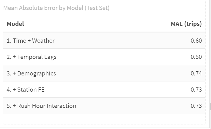 **Interpretation**: From Model 3 to Model 7, we keep adding more variables and refining the specification, but the improvement over Model 2 is quite limited. After including temporal lags in Model 2, the MAE already drops from 0.83 to about 0.69 trips, and this remains the dominant gain. Models 3–5 add demographics, station fixed effects, and a rush-hour interaction, and Models 6–7 further adjust weather, weekend, distance, and holiday variables. However, the MAE stays in a very narrow range around 0.68–0.676, which is only a small improvement compared to Model 2.