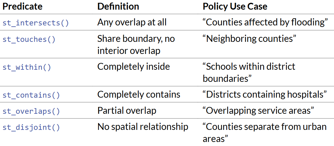 st_touches looks for neighborsst_withinst_intersects includes the reference feature itself.predicate specified, uses st_intersects