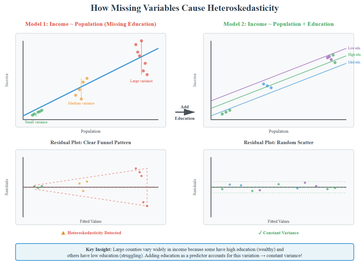 It is important to understand the assumptions behind a model. For example, heteroskedasticity is often an indicator of model misspecification – it indicates missing variables that matter more at certain X values. Population alone predicts income well in rural counties, but large urban counties need additional variables (education, industry) to predict accurately.