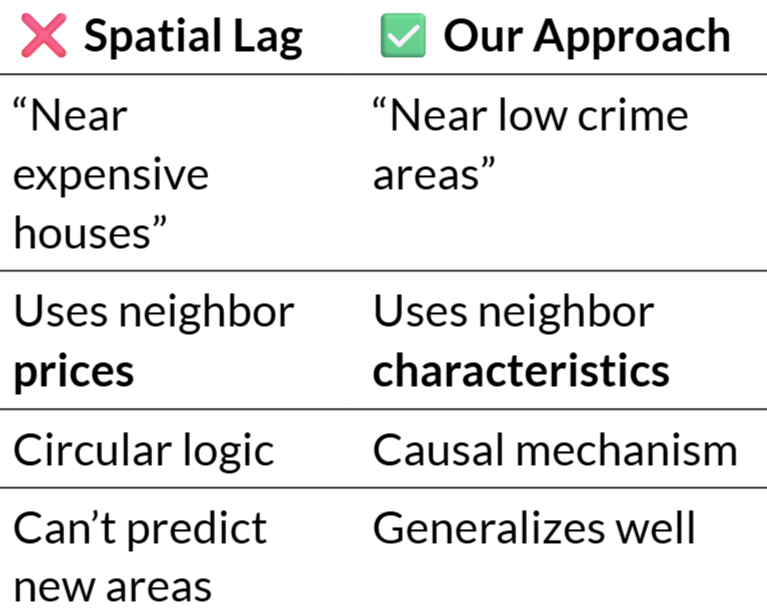 - our predicton approach: Instead of modeling dependence in Y (prices), model proximity in X (predictors)