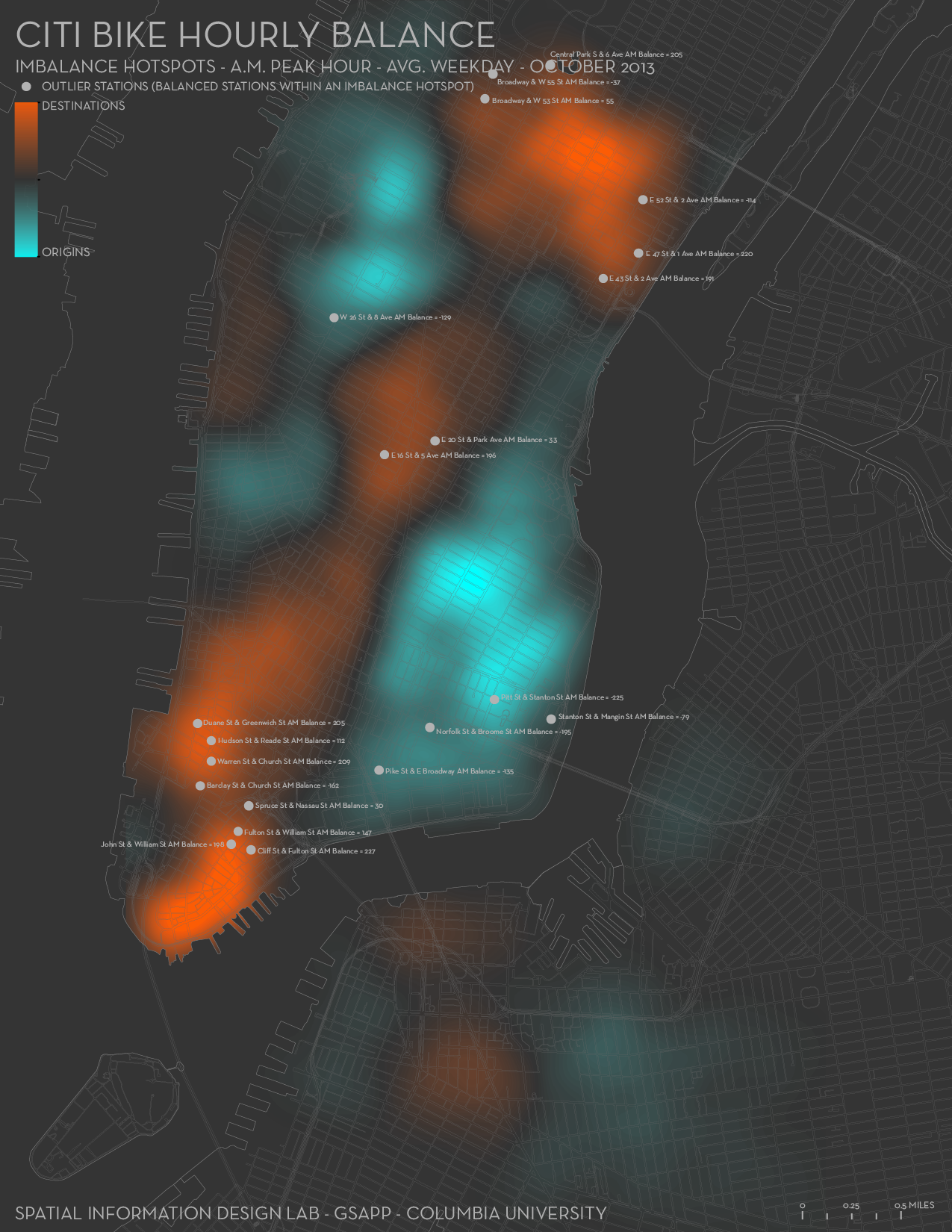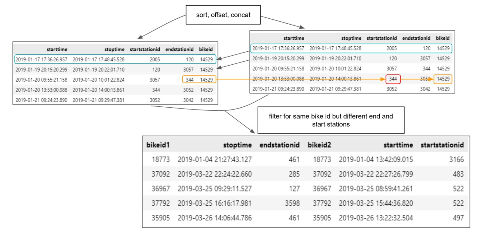 Identifying Rebalance Movements: “The easiest method for a given bike is to compare the starting station for each trip with the ending station of the previous trip. If the bike appears to have teleported from one station to another between trips, it most likely was rebalanced!”