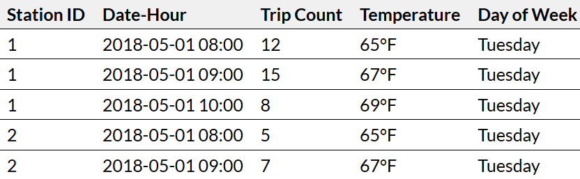 # Hourly Binningdat60 <- dat %>%mutate(interval60 =floor_date(ymd_hms(start_time), unit ="hour"))dat15 <- dat %>%mutate(interval15 =floor_date(ymd_hms(start_time), unit ="15 mins"))# Extracting Time Featuresdat60 <- dat %>%mutate(interval60 =floor_date(ymd_hms(start_time), unit ="hour"),week =week(interval60), # Week of year (1-52)dotw =wday(interval60, label=TRUE), # Day of week (Mon, Tue, ...)hour =hour(interval60) # Hour of day (0-23) )