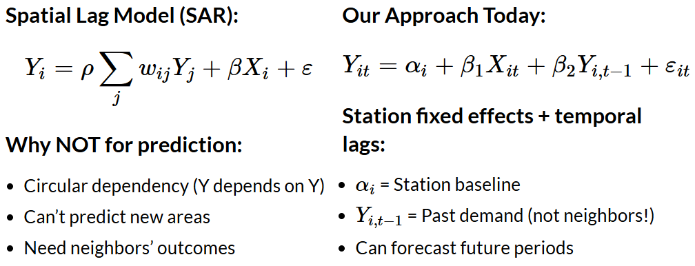 # Joining Station Attributesstation_data <- dat_census %>%group_by(from_station_id) %>%summarize(from_latitude =first(from_latitude),from_longitude =first(from_longitude),Med_Inc =first(Med_Inc),Percent_White =first(Percent_White),# ... other demographics )# Join to panelstudy.panel <- study.panel %>%left_join(station_data, by ="from_station_id")