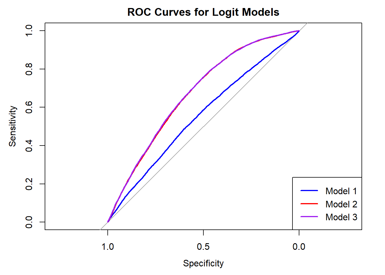 plot(roc1, col ="blue", lwd =2, main ="ROC Curves for Logit Models")plot(roc2, col ="red", lwd =2, add =TRUE)plot(roc3, col ="purple", lwd =2, add =TRUE)legend("bottomright",legend =c("Model 1", "Model 2", "Model 3"),col =c("blue", "red", "purple"),lwd =2)