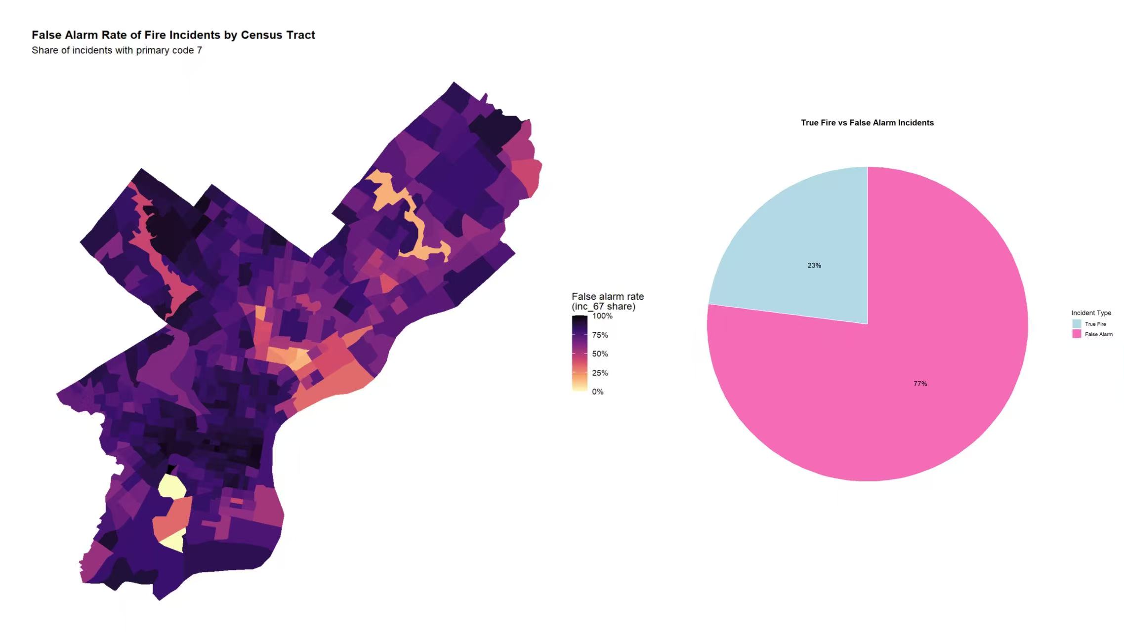 | Fire Incidents (NFIRS-coded) | Incident points (2024–2025) | Label: 1 = 7xx false alarm; 0 = 1xx/2xx; time + geometry |